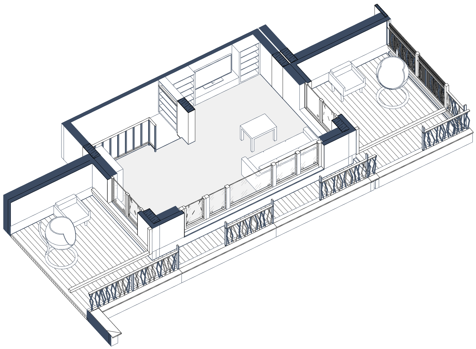 Двор закрыт от машин и оформлен в стиле скандинавского натурализма. Он похож на парк, сформировавшийся без участия человека и сохраняющий обаяние в течение всего года. Под домом запроектирован подземный паркинг, а также кладовые для хранения сезонных вещей.