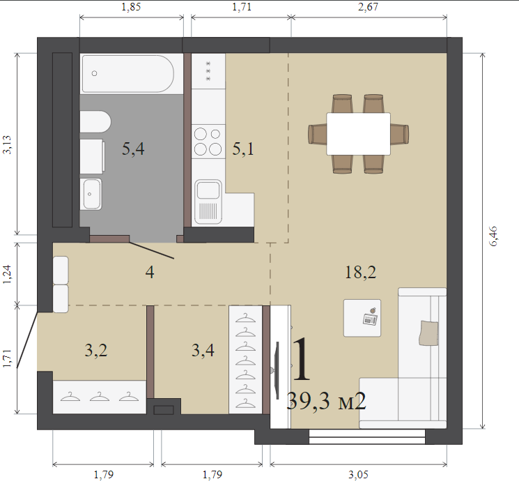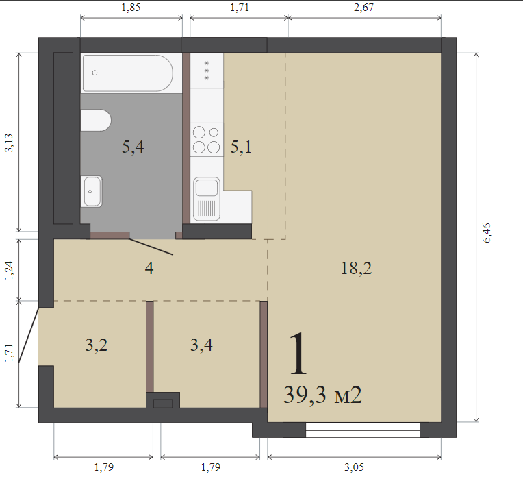 1-к квартира | 39.00 м² | 13 - 20 эт.
