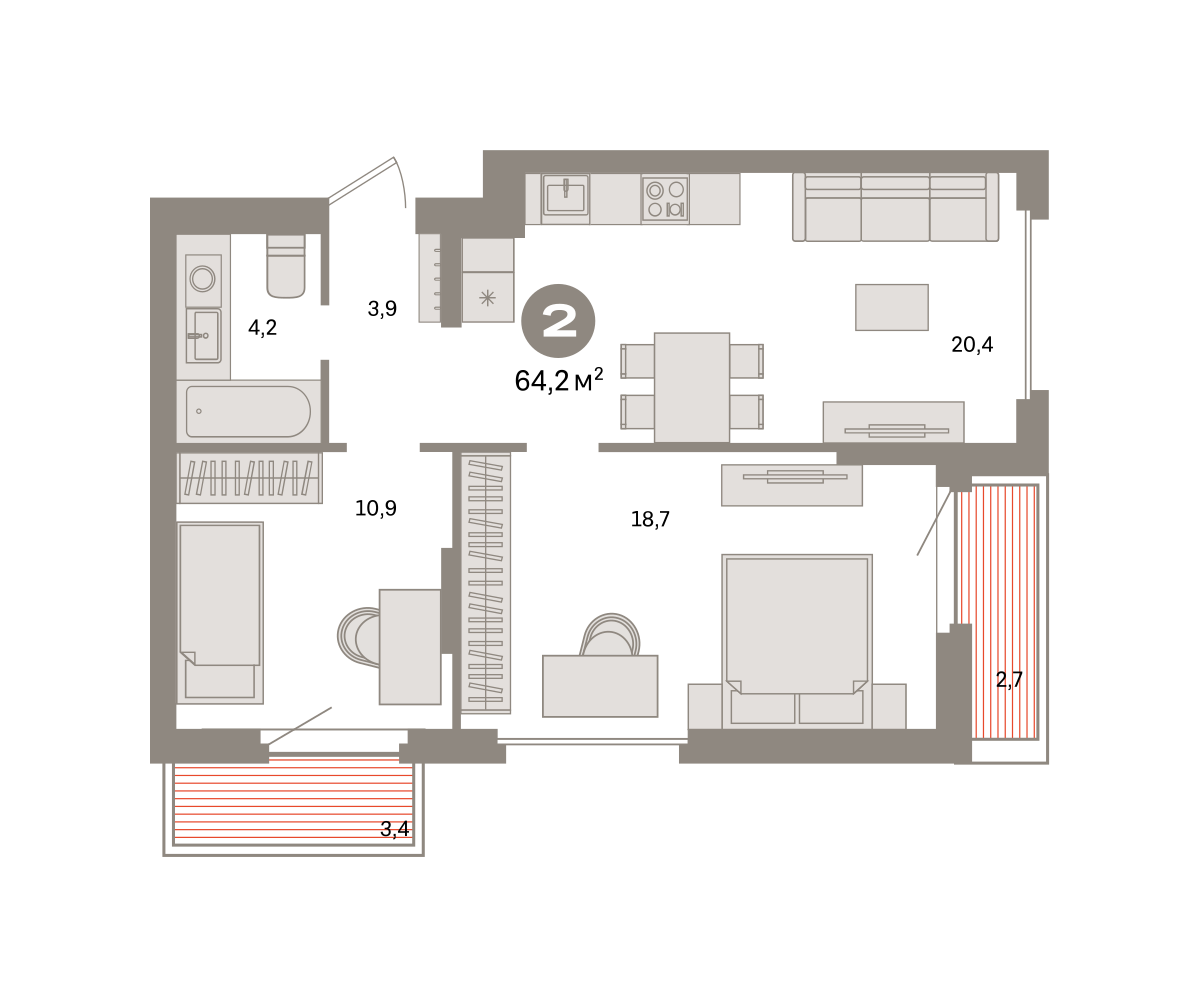 Продаётся с кладовой. Квартира с кухней-гостиной и двумя спальнями в квартале «Депо». Особенности планировки: балкон, двойная выгода, предчистовая отделка, разнесённые спальни. № квартиры в нашей базе: ДЕП04-Ж5.7.5.