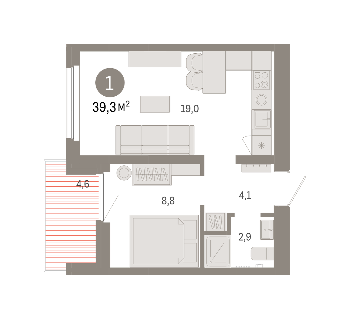 Квартира с кухней-гостиной и одной спальней в Бруснике в Академическом. Особенности планировки: балкон, ипотека 10%, предчистовая отделка. № квартиры в нашей базе: АКД04-Ж5.2.3.