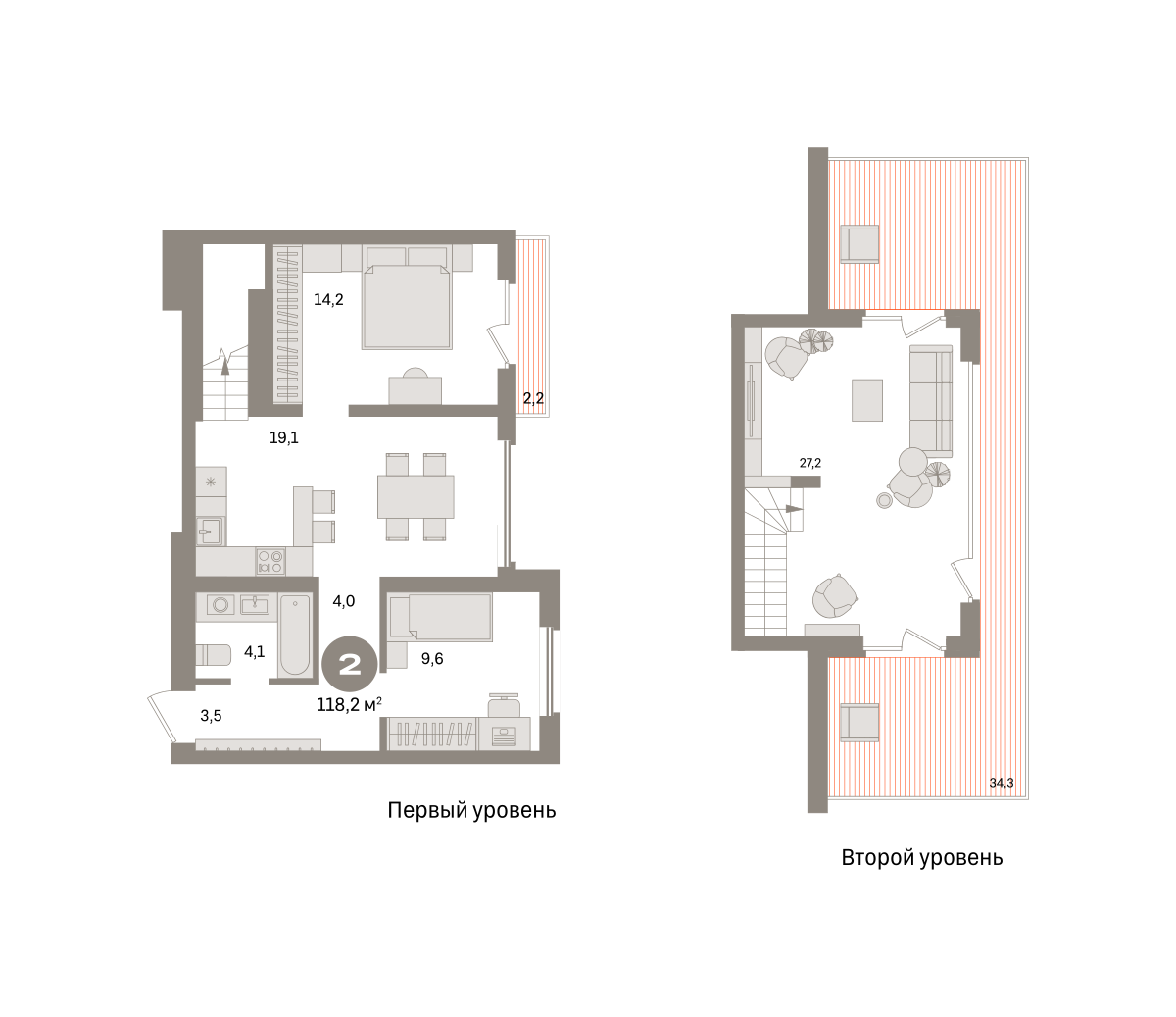 Двухуровневая квартира с кухней-гостиной и двумя спальнями в Южных кварталах. Особенности планировки: двухуровневая, окна в пол, окно в коридоре, предчистовая отделка, разнесённые спальни, терраса на крыше.