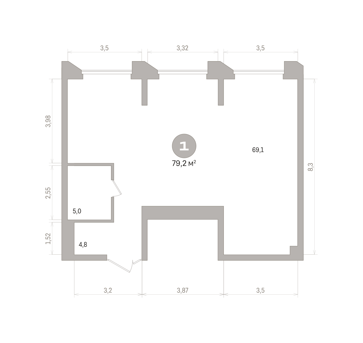 Квартира с кухней-гостиной и двумя спальнями в проекте Гоголя 21. Особенности планировки: свободная планировка. № квартиры в нашей базе: ЗНГ01-Ж1.5.5.