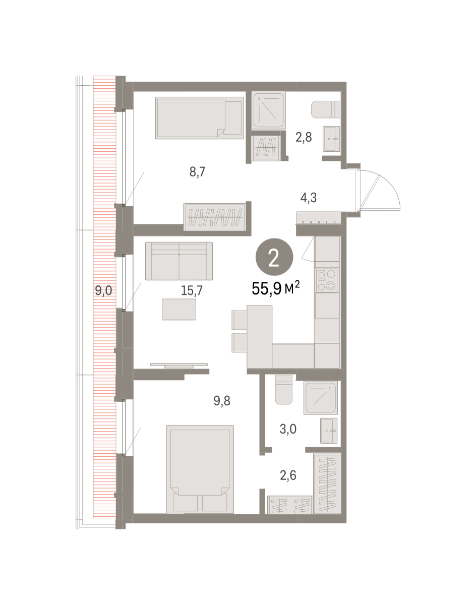Продаётся с кладовой. Квартира с кухней-гостиной и двумя спальнями в Бруснике в Академическом. Особенности планировки: гардеробная, мастер-спальня, предчистовая отделка, разнесённые спальни, терраса на крыше. № квартиры в нашей базе: АКД05-Ж8.8.3.