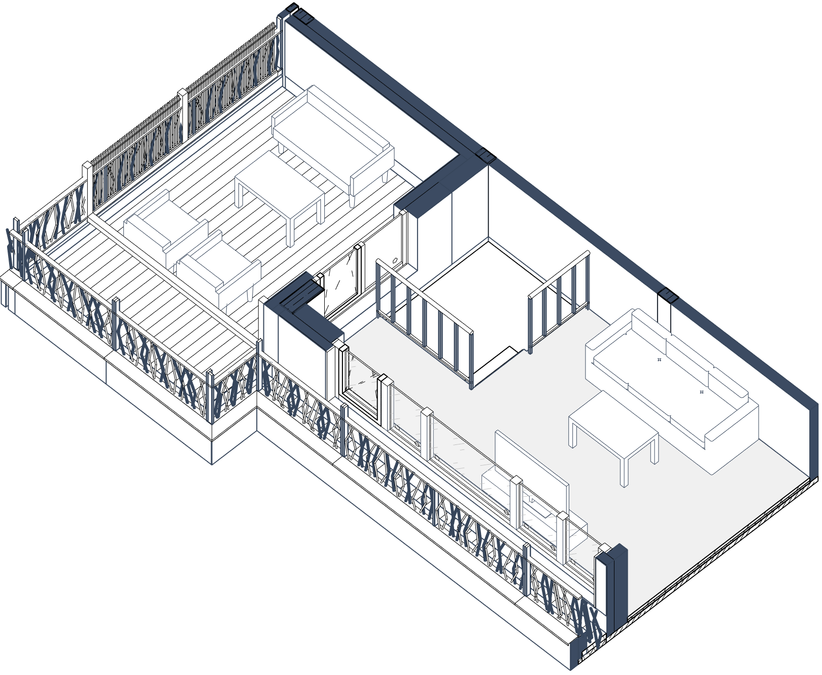 Двор закрыт от машин и оформлен в стиле скандинавского натурализма. Он похож на парк, сформировавшийся без участия человека и сохраняющий обаяние в течение всего года. Под домом запроектирован подземный паркинг, а также кладовые для хранения сезонных вещей.