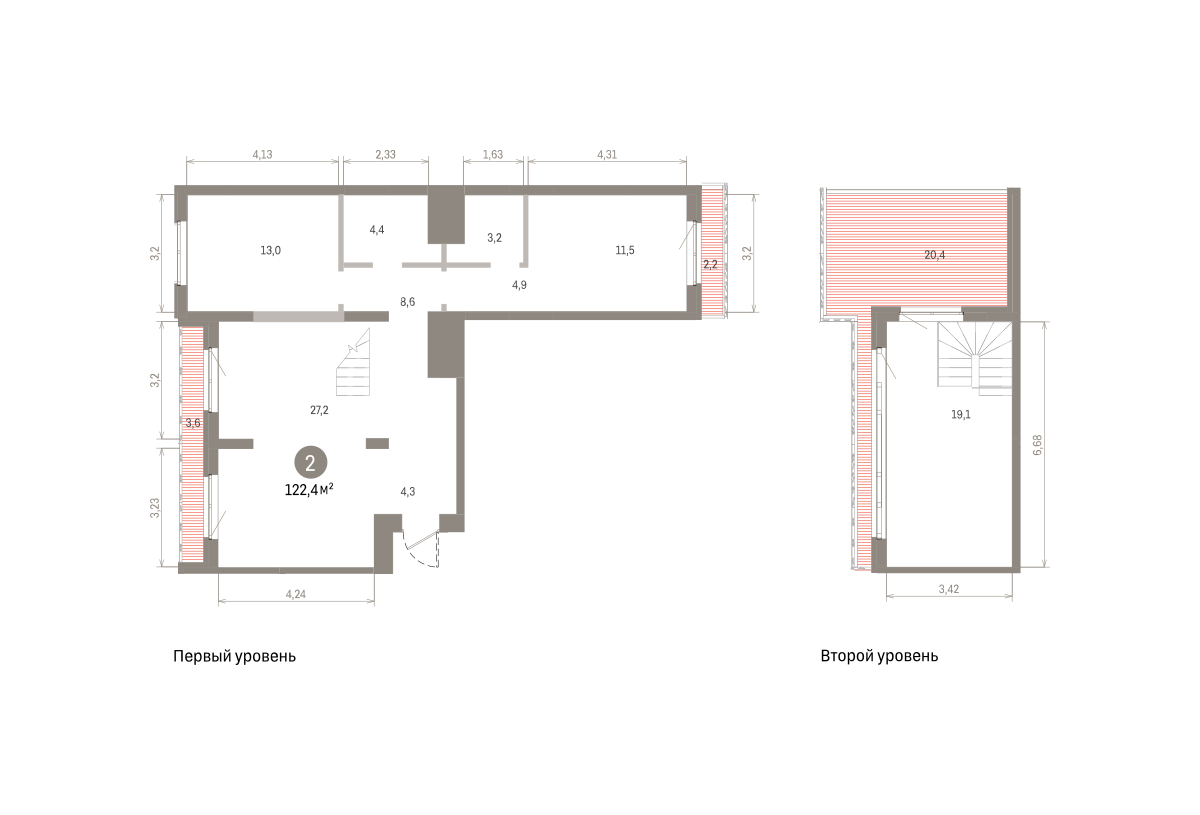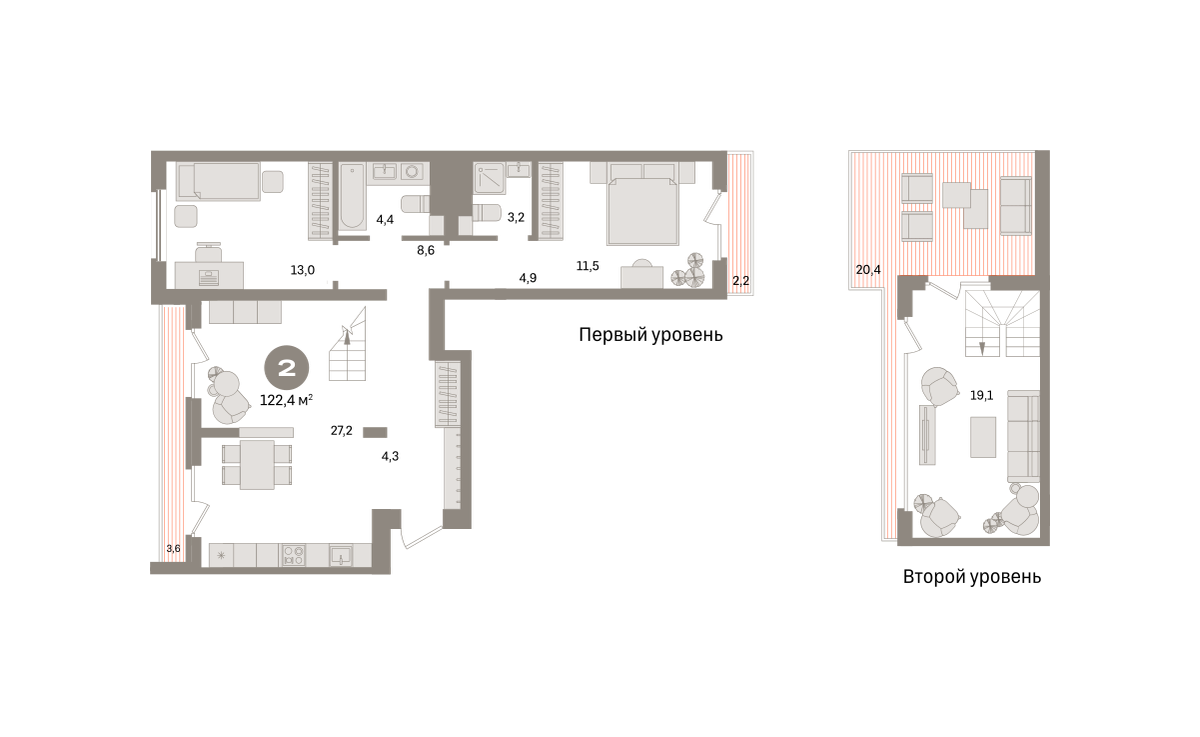 Двухуровневая квартира с кухней-гостиной и двумя спальнями в Южных кварталах. Особенности планировки: вид во двор, гардеробная, двухуровневая, мастер-спальня, окна на две стороны, предчистовая отделка, разнесённые спальни, терраса на крыше.