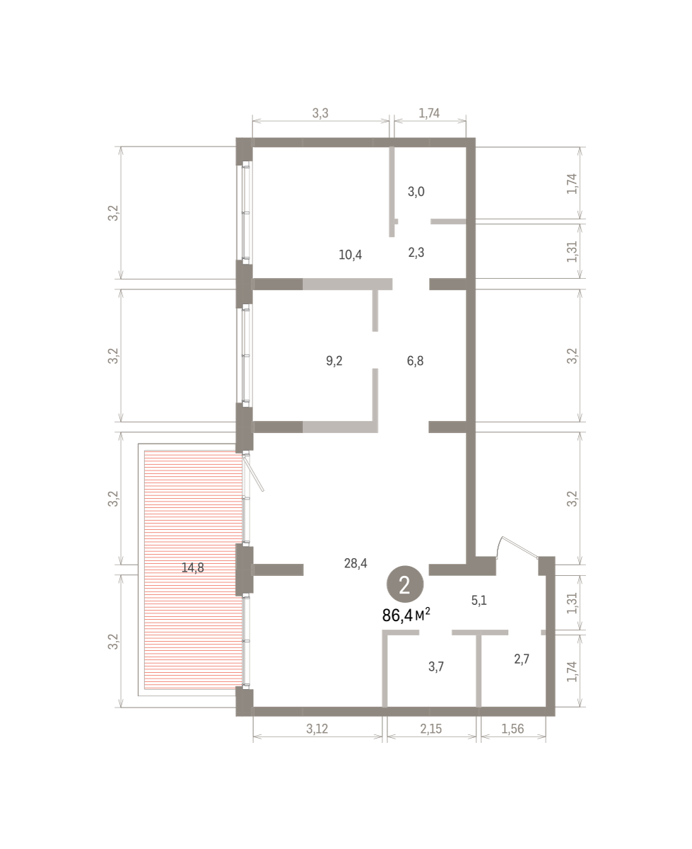 Квартира с кухней-гостиной и двумя спальнями в Южных кварталах. Особенности планировки: вид во двор, гардеробная, мастер-спальня, панорамное остекление, потолки 3 м и выше, предчистовая отделка, терраса. № квартиры в нашей базе: ЮКВ08-Ж3.2.6.