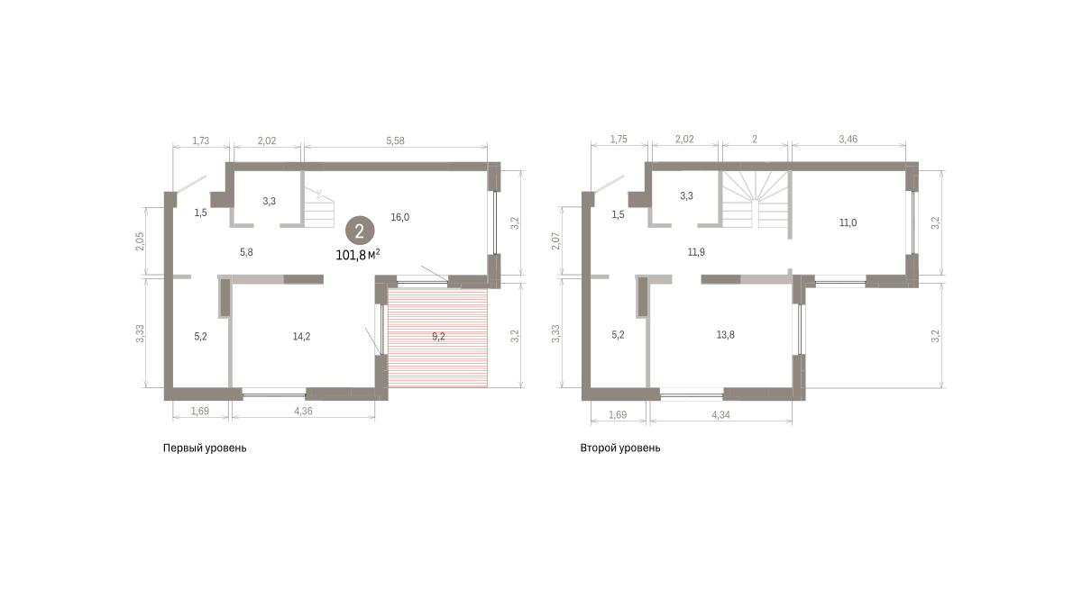 Двухуровневая квартира с кухней-гостиной и двумя спальнями в Южных кварталах. Особенности планировки: второй санузел, гардеробная, двухуровневая, окна в пол, предчистовая отделка, терраса на крыше.