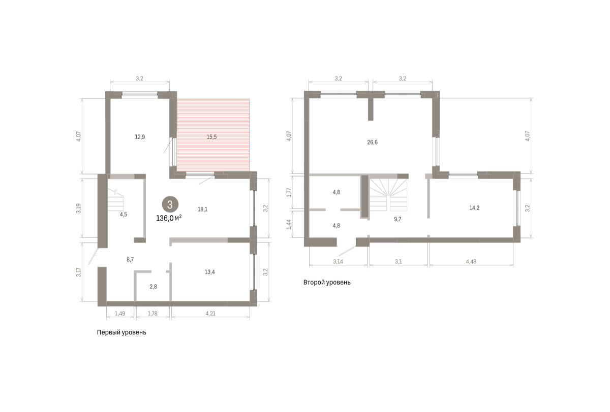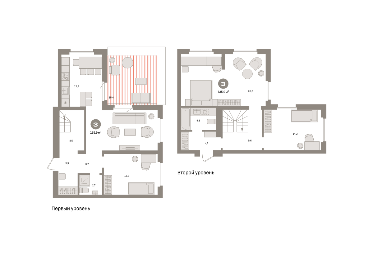 Двухуровневая квартира с кухней-гостиной и тремя спальнями в Южных кварталах. Особенности планировки: второй санузел, гардеробная, двухуровневая, окна в пол, предчистовая отделка, разнесённые спальни, терраса на крыше.