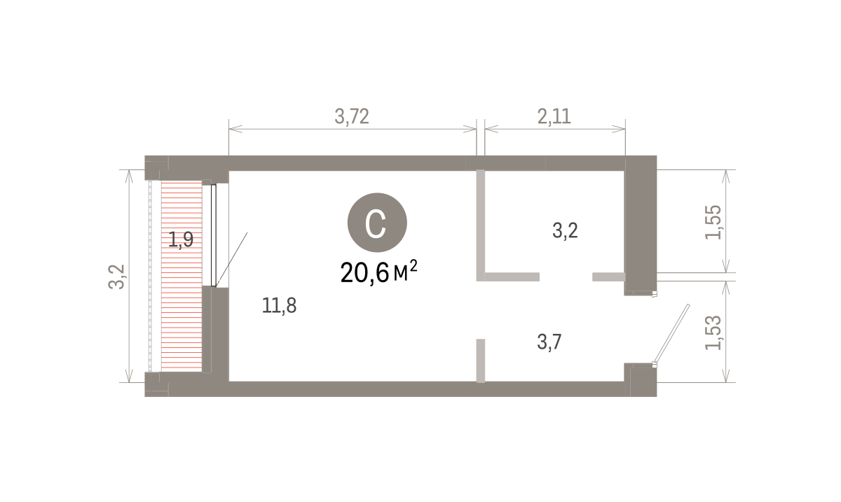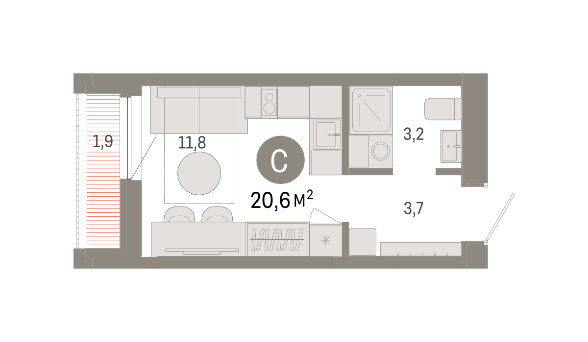 Студия в Южных кварталах. Особенности планировки: лоджия, предчистовая отделка. № квартиры в нашей базе: ЮКВ11-Ж5.7.4.