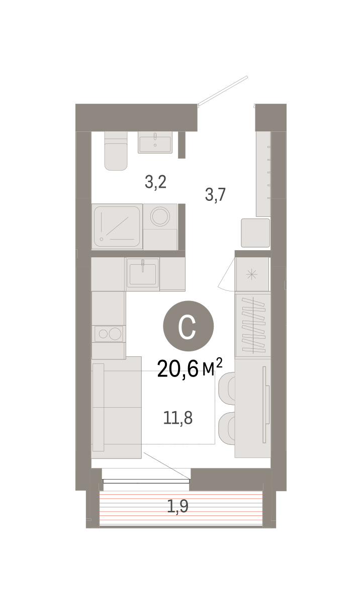 Студия в Южных кварталах. Особенности планировки: лоджия, предчистовая отделка. № квартиры в нашей базе: ЮКВ11-Ж2.8.6.