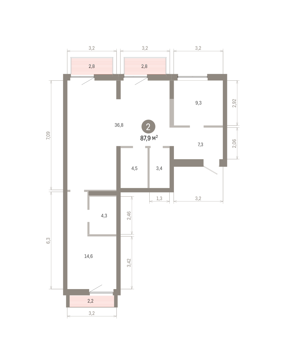 Квартира с кухней-гостиной и двумя спальнями в Южных кварталах. Особенности планировки: балкон, вид во двор, лоджия, мастер-спальня, окна на две стороны, постирочная, предчистовая отделка, разнесённые спальни.