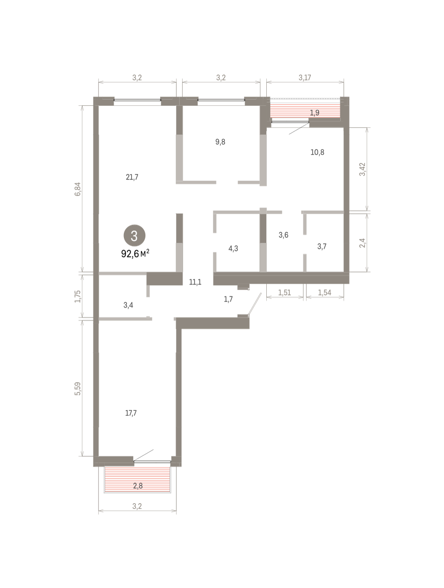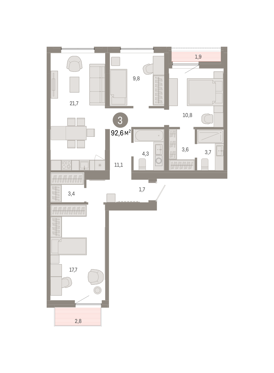 Квартира с кухней-гостиной и тремя спальнями в Южных кварталах. Особенности планировки: балкон, вид во двор, гардеробная, лоджия, мастер-спальня, окна на две стороны, предчистовая отделка, разнесённые спальни.