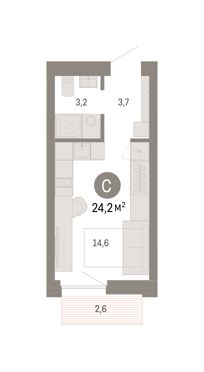 Студия в Южных кварталах. Особенности планировки: балкон, предчистовая отделка. № квартиры в нашей базе: ЮКВ11-Ж2.7.6.