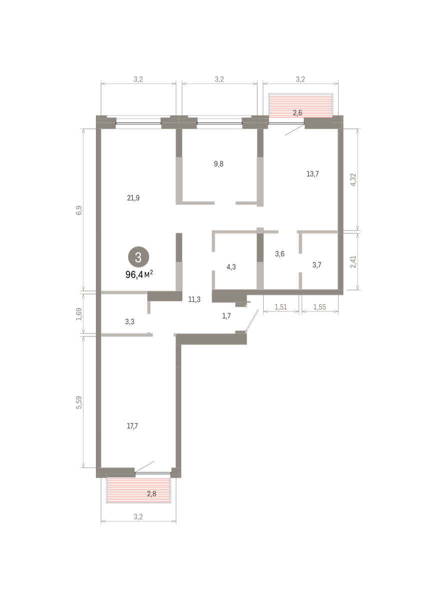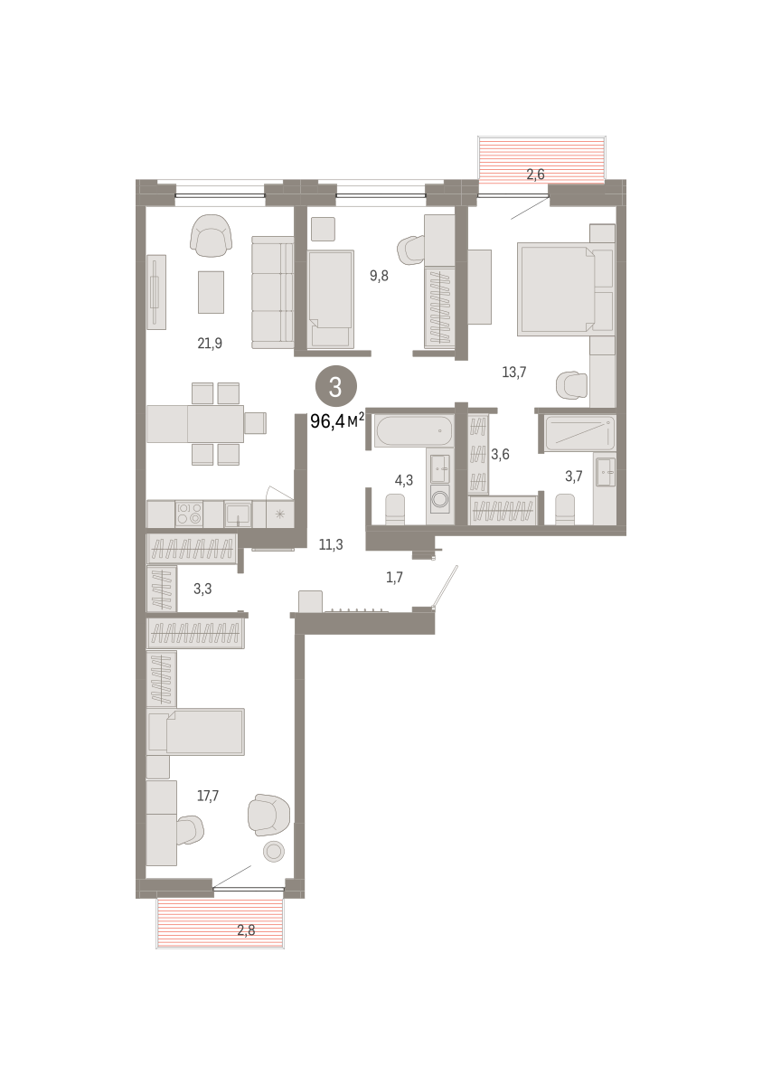 Квартира с кухней-гостиной и тремя спальнями в Южных кварталах. Особенности планировки: балкон, вид во двор, гардеробная, мастер-спальня, окна на две стороны, предчистовая отделка, разнесённые спальни.
