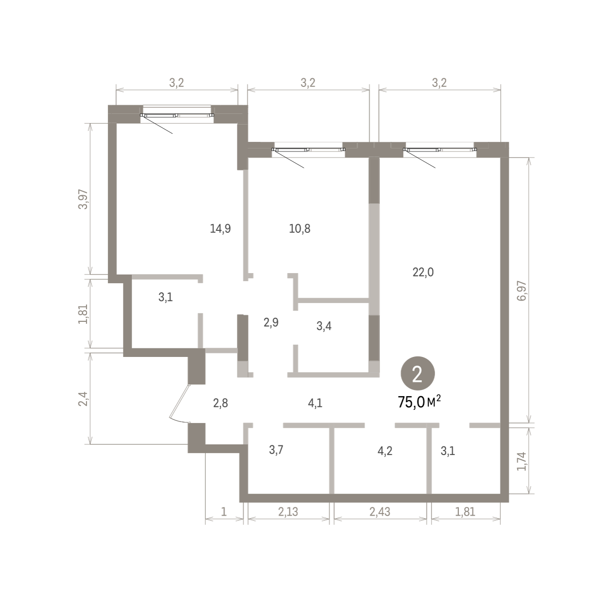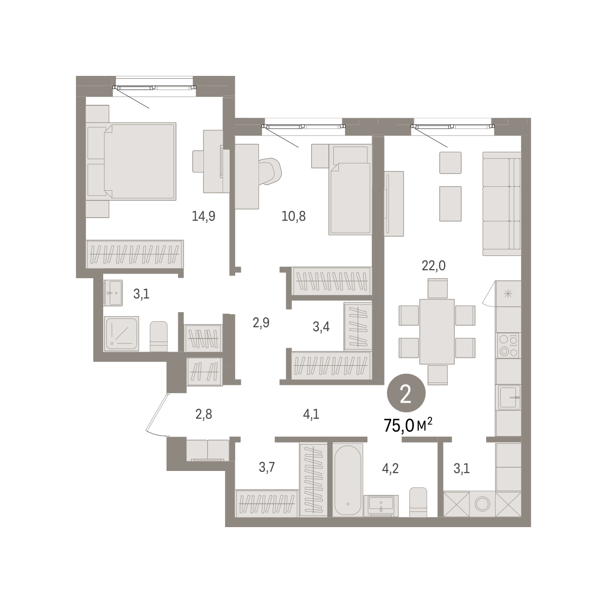 Продаётся с кладовой. Квартира с кухней-гостиной и двумя спальнями в Южных кварталах. Особенности планировки: гардеробная, мастер-спальня, постирочная, потолки 3 м и выше, предчистовая отделка. № квартиры в нашей базе: ЮКВ08-Ж1.2.6.