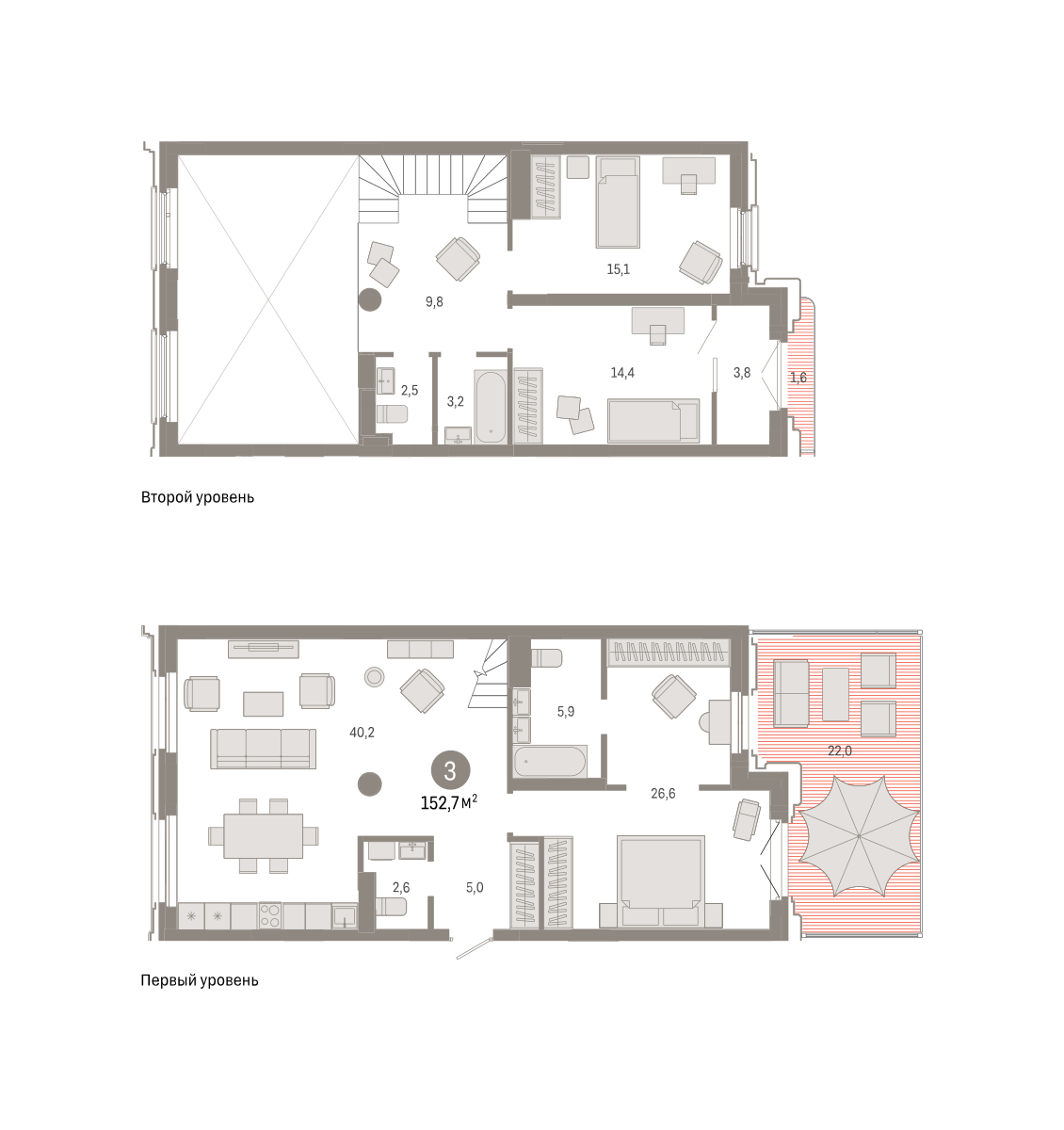 Двухуровневая квартира с кухней-гостиной и тремя спальнями в квартале «На Некрасова». Особенности планировки: балкон, вид во двор, второй санузел, второй свет, двухуровневая, мастер-спальня, окна в пол, окно в коридоре, потолки 3 м и выше, предчистовая отделка, разнесённые спальни, терраса, терраса на крыше, тёплая лоджия.