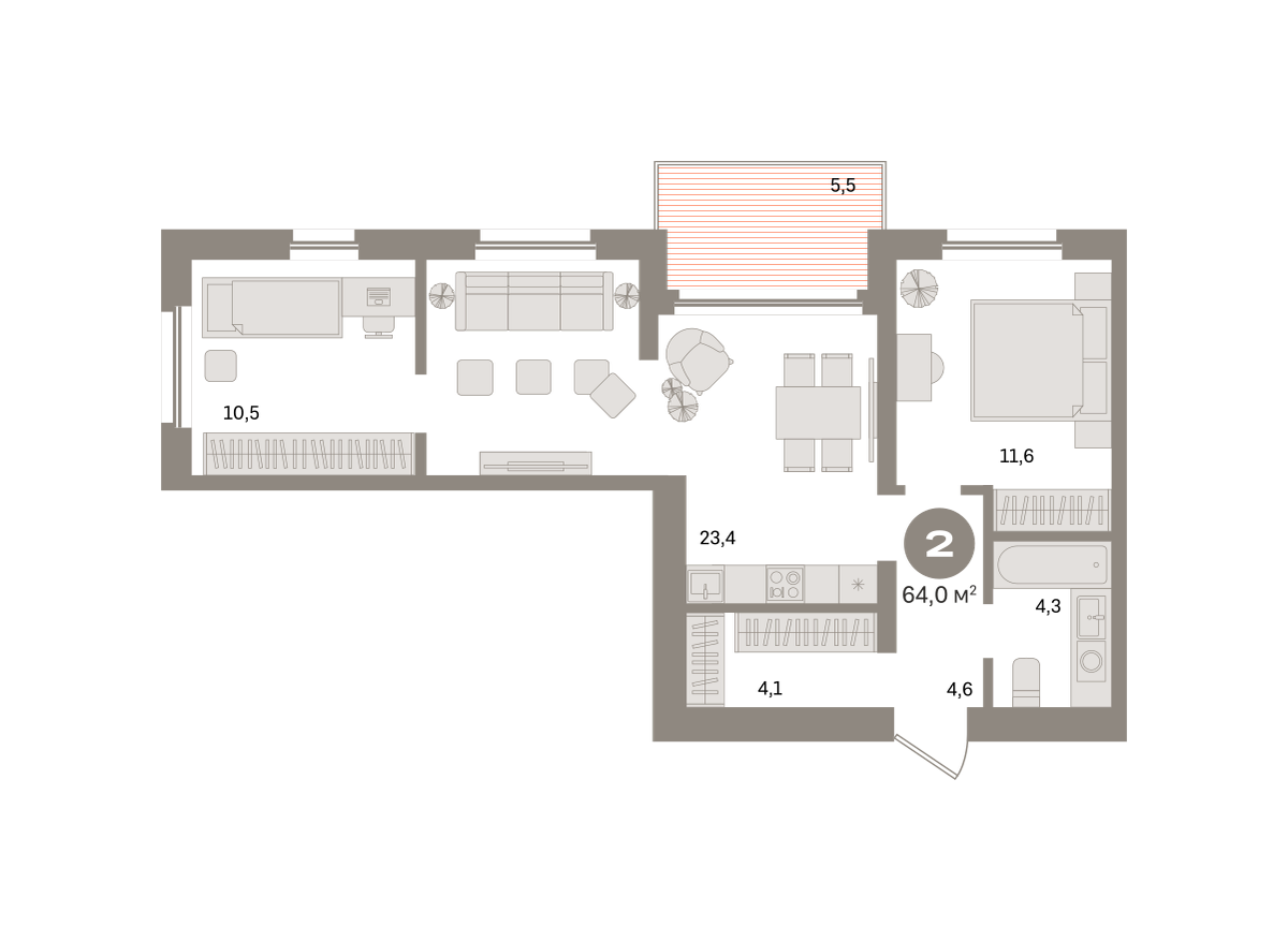 Квартира с кухней-гостиной и двумя спальнями в Южных кварталах. Особенности планировки: балкон, гардеробная, предчистовая отделка, разнесённые спальни.