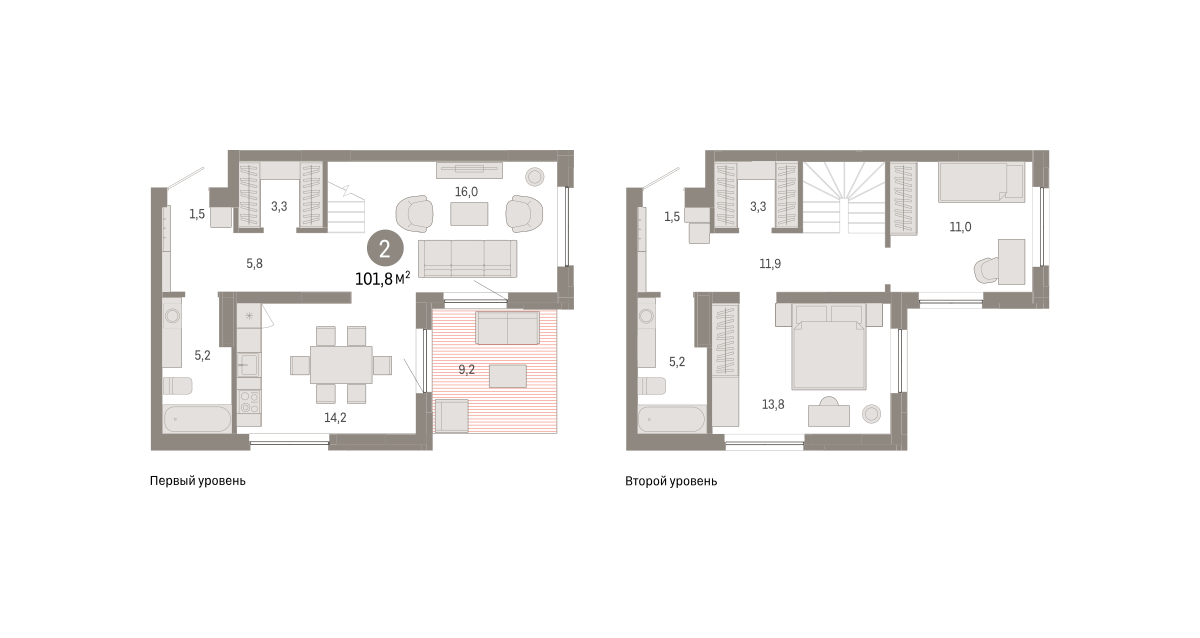 Двухуровневая квартира с кухней-гостиной и двумя спальнями в Южных кварталах. Особенности планировки: второй санузел, гардеробная, двухуровневая, окна в пол, предчистовая отделка, терраса на крыше.