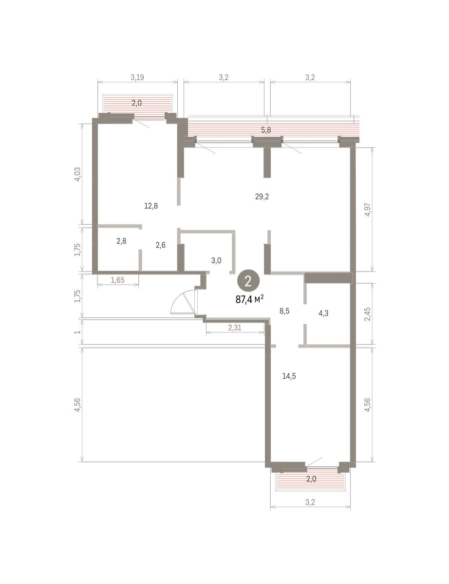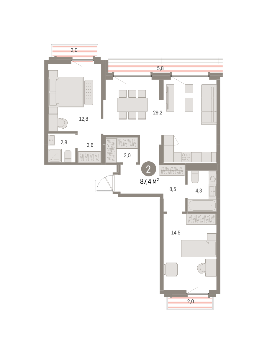 Квартира с кухней-гостиной и двумя спальнями в Бруснике в Академическом. Особенности планировки: балкон, вид во двор, гардеробная, мастер-спальня, окна на две стороны, предчистовая отделка, разнесённые спальни, терраса на крыше.