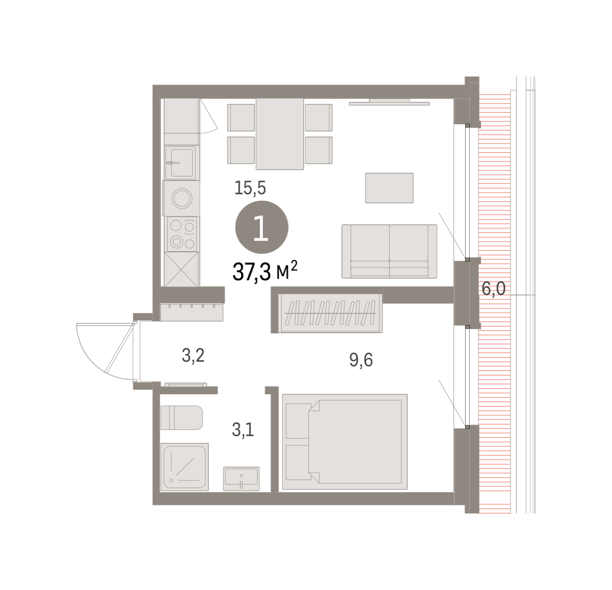 Квартира с кухней-гостиной и одной спальней в Бруснике в Академическом. Особенности планировки: предчистовая отделка, терраса на крыше. № квартиры в нашей базе: АКД05-Ж5.7.2.