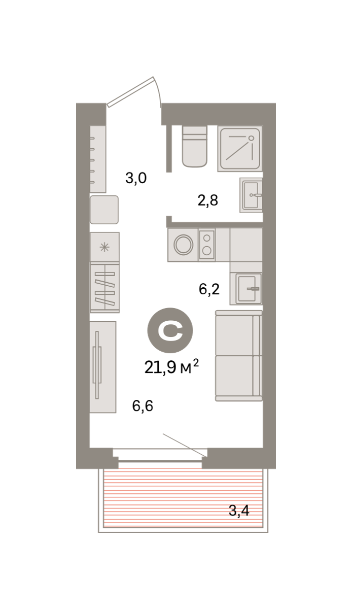 Студия в квартале «Депо». Особенности планировки: балкон, предчистовая отделка. № квартиры в нашей базе: ДЕП07-Ж5.7.4.
