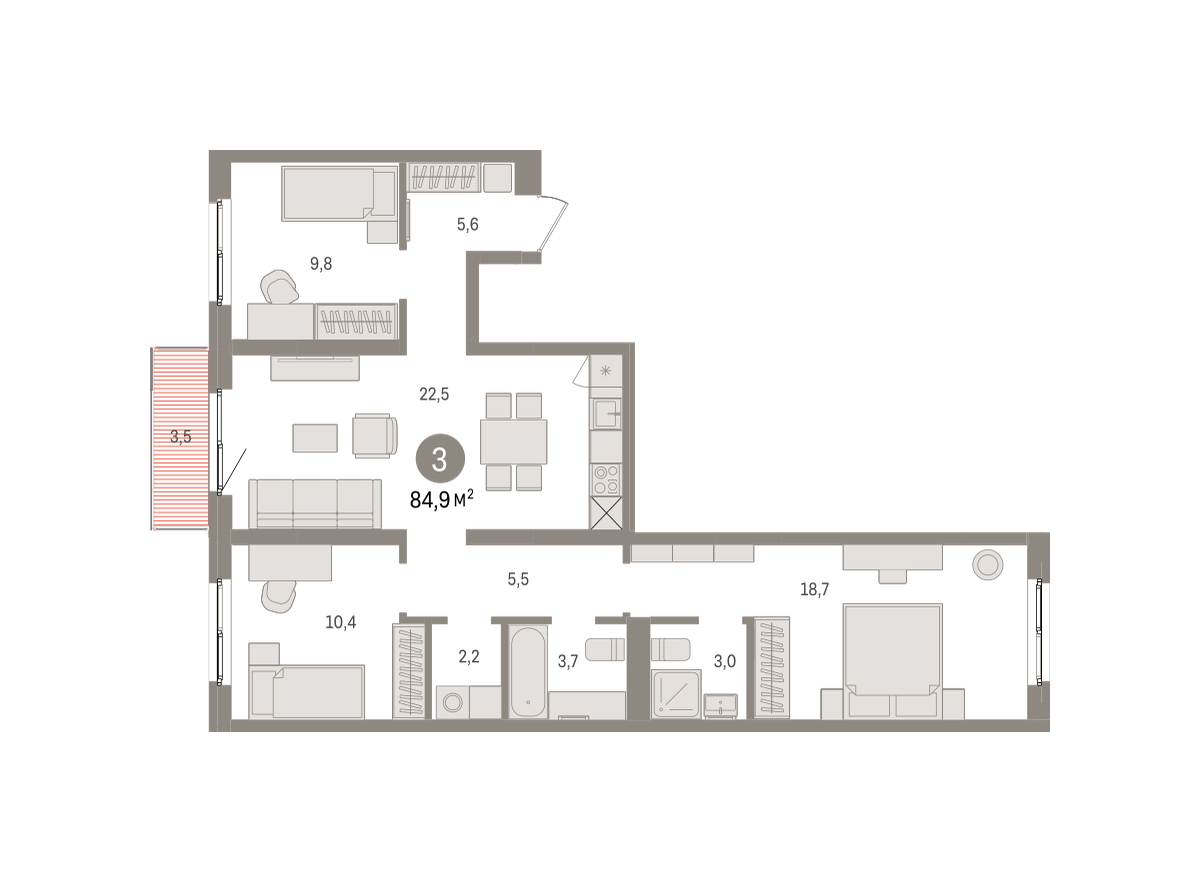 Продаётся с кладовой. Квартира с кухней-гостиной и тремя спальнями в Южных кварталах. Особенности планировки: балкон, мастер-спальня, окна на две стороны, постирочная, предчистовая отделка, разнесённые спальни. № квартиры в нашей базе: ЮКВ08-Ж4.3.6.