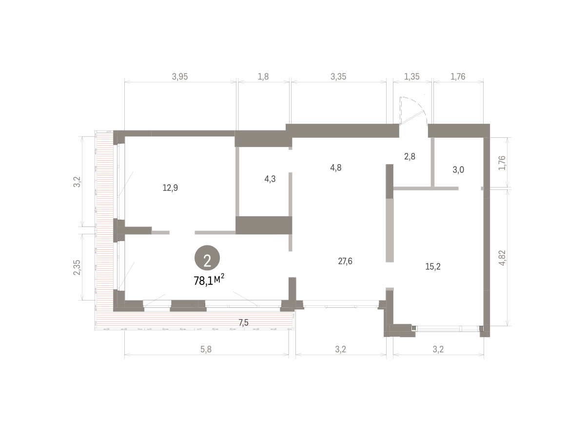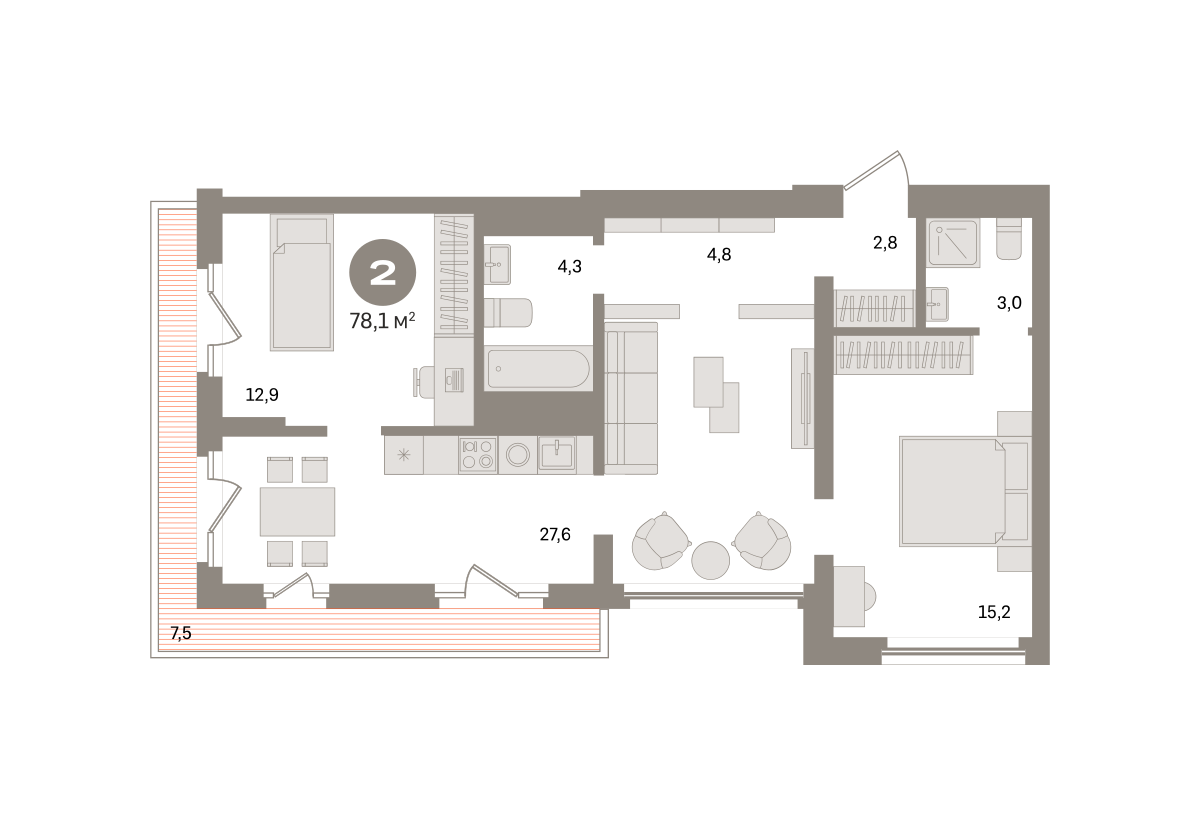 Квартира с кухней-гостиной и двумя спальнями в Южных кварталах. Особенности планировки: мастер-спальня, предчистовая отделка, разнесённые спальни, терраса на крыше.