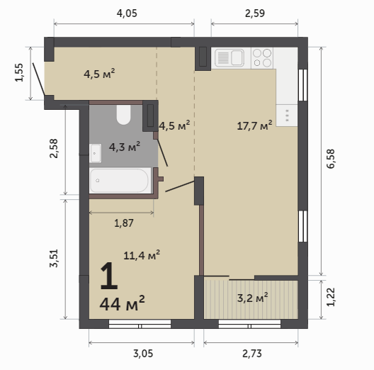 44.00 м² | 4 - 9 эт.