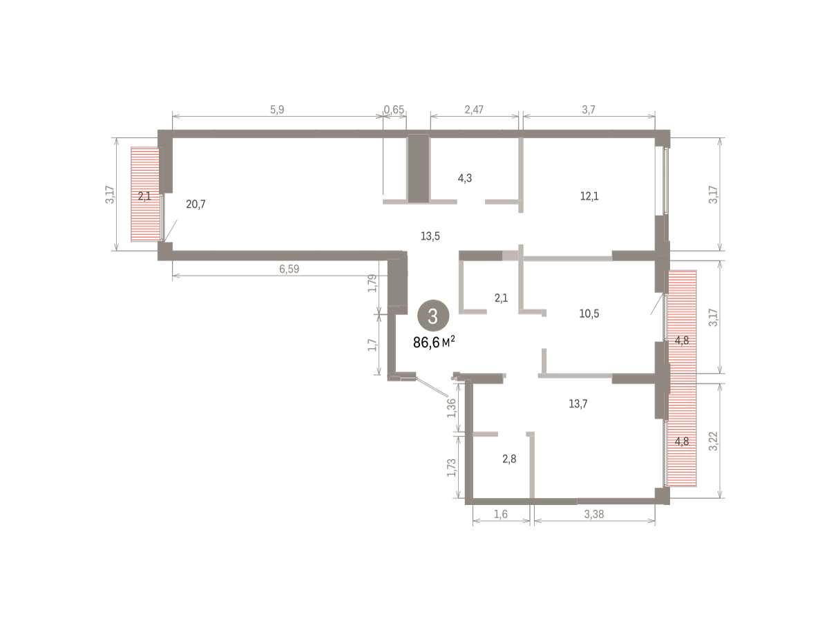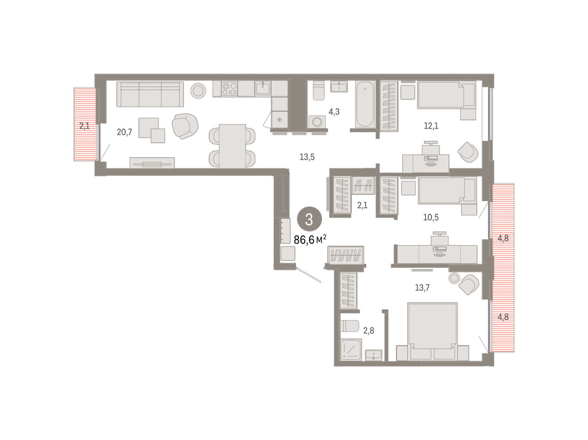 Квартира с кухней-гостиной и тремя спальнями в районе Шишимская горка. Особенности планировки: балкон, гардеробная, мастер-спальня, окна на две стороны, предчистовая отделка, рабочий кабинет, разнесённые спальни.