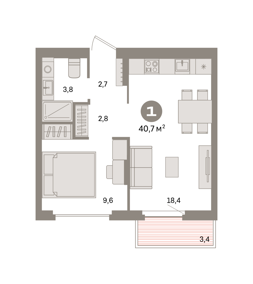 Квартира с кухней-гостиной и одной спальней в квартале «Депо». Особенности планировки: балкон, предчистовая отделка. № квартиры в нашей базе: ДЕП04-Ж7.5.2.