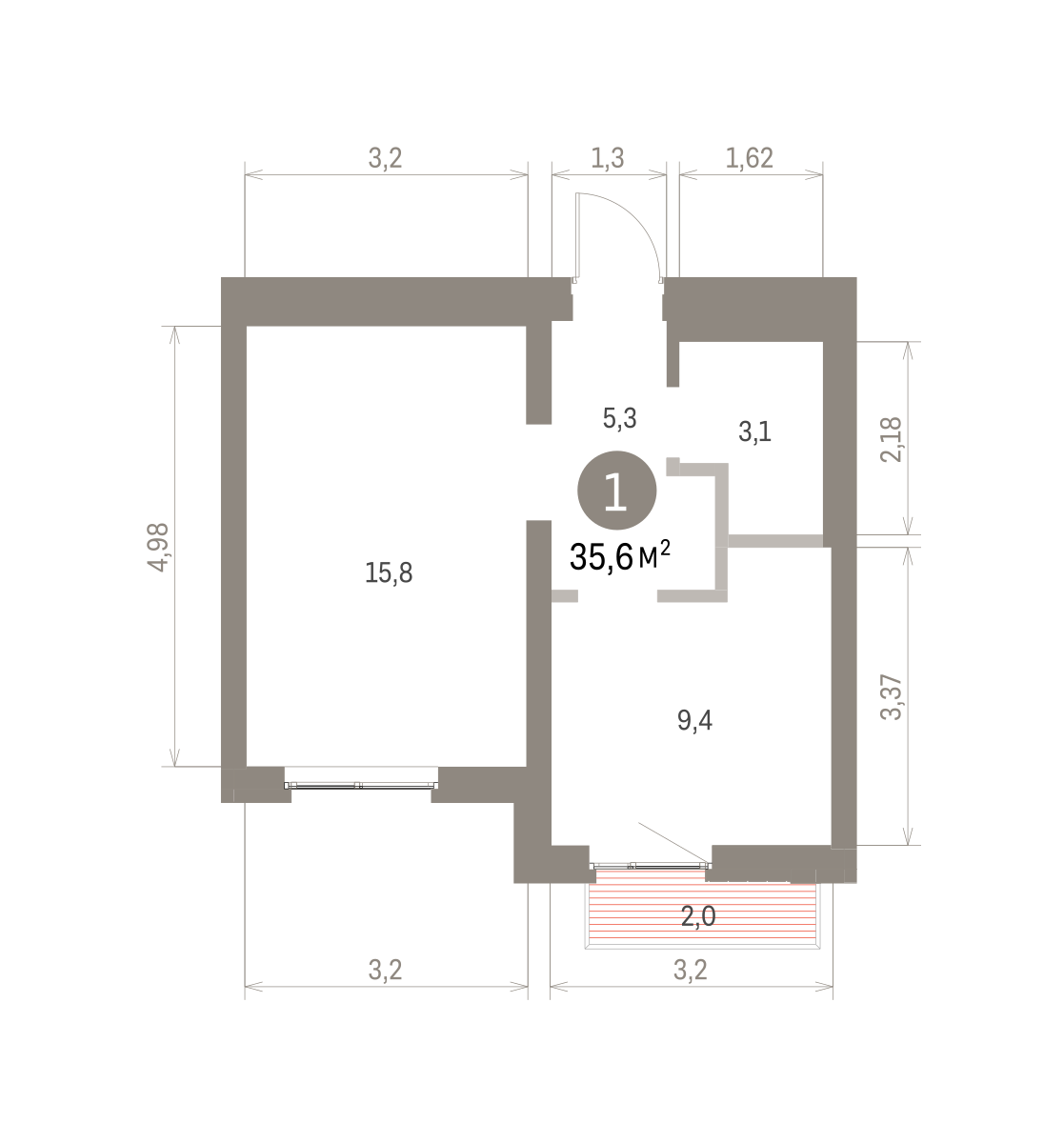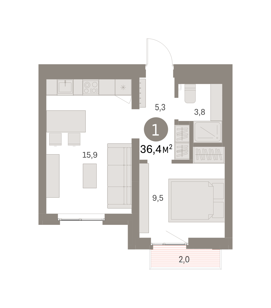 Квартира с кухней-гостиной и одной спальней в Бруснике в Академическом. Особенности планировки: балкон, предчистовая отделка. № квартиры в нашей базе: АКД04-Ж2.7.7.