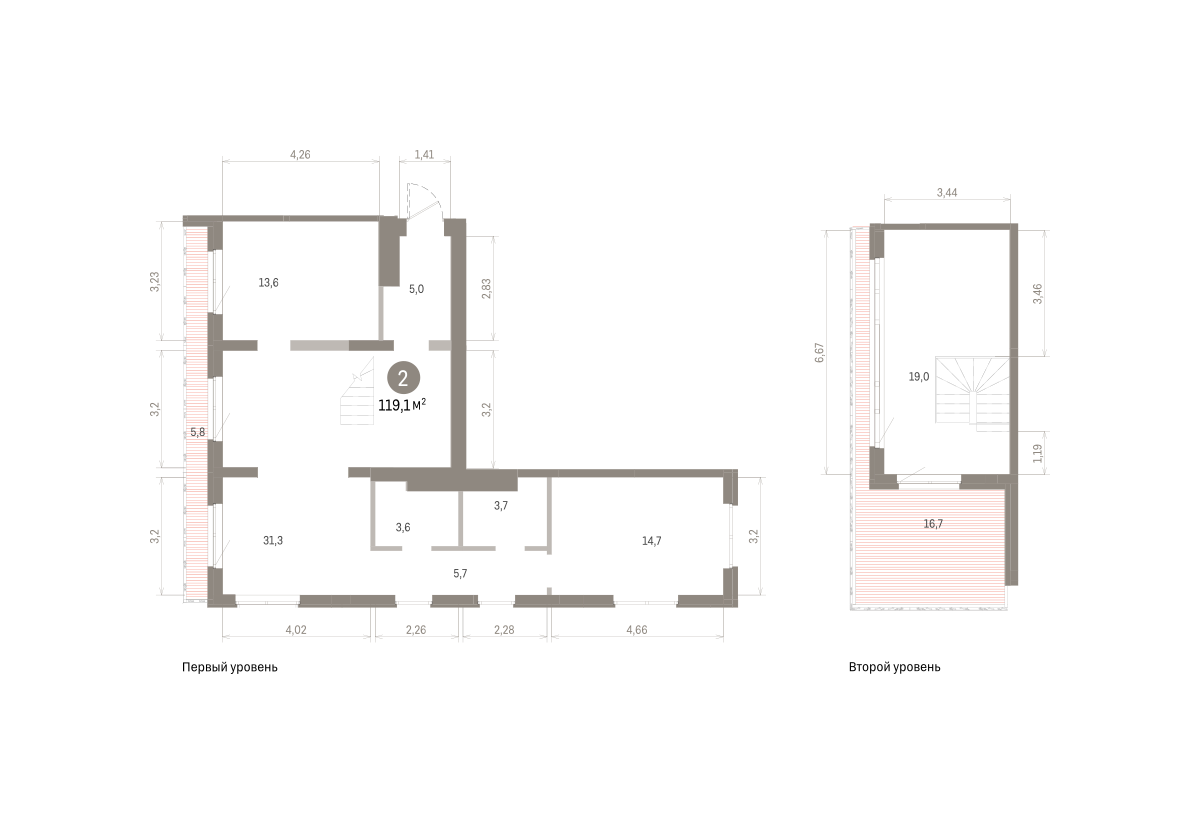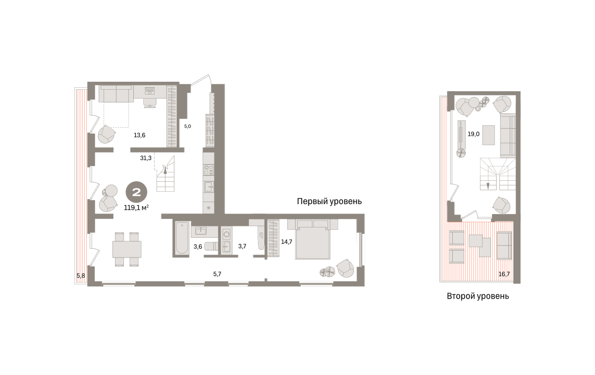 Двухуровневая квартира с кухней-гостиной и двумя спальнями в Южных кварталах. Особенности планировки: вид во двор, двухуровневая, окна в пол, окно в коридоре, постирочная, предчистовая отделка, разнесённые спальни, терраса на крыше.