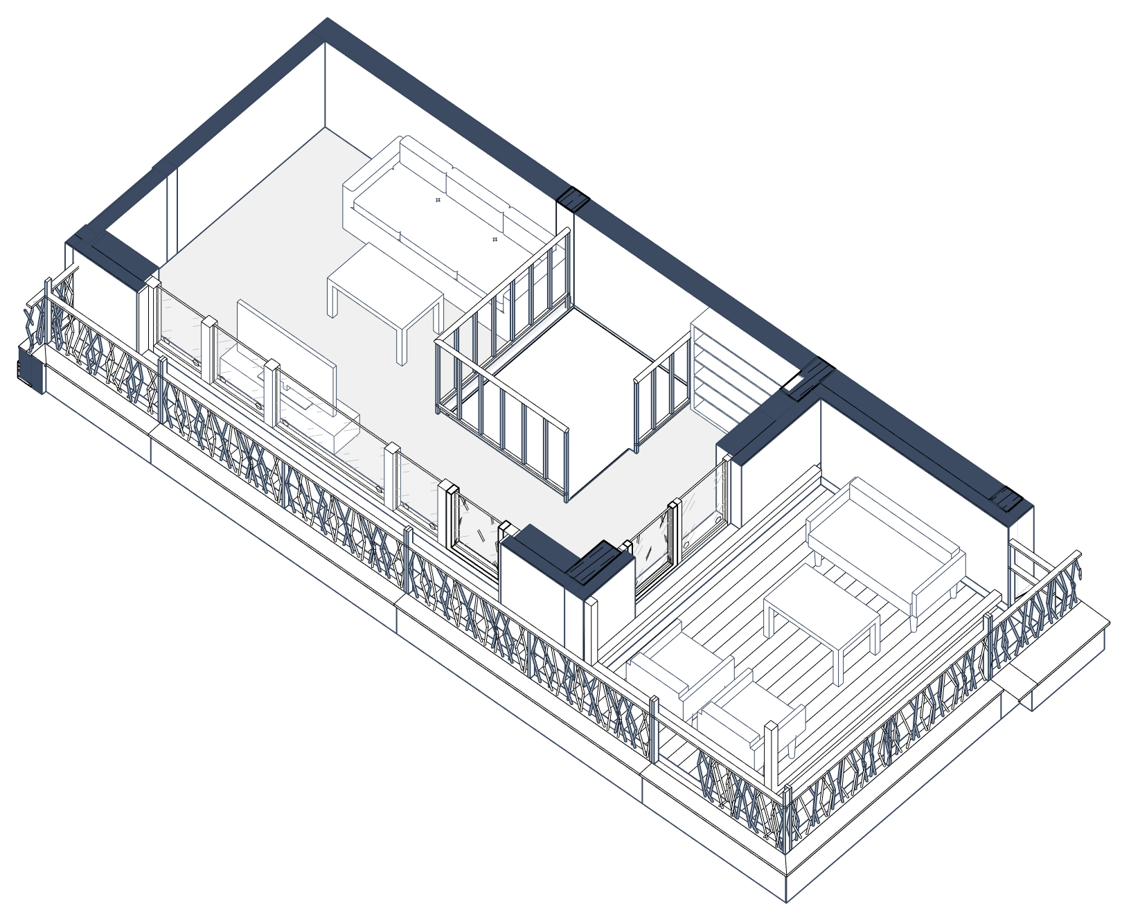 Двор закрыт от машин и оформлен в стиле скандинавского натурализма. Он похож на парк, сформировавшийся без участия человека и сохраняющий обаяние в течение всего года. Под домом запроектирован подземный паркинг, а также кладовые для хранения сезонных вещей.