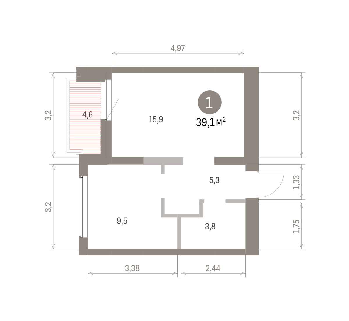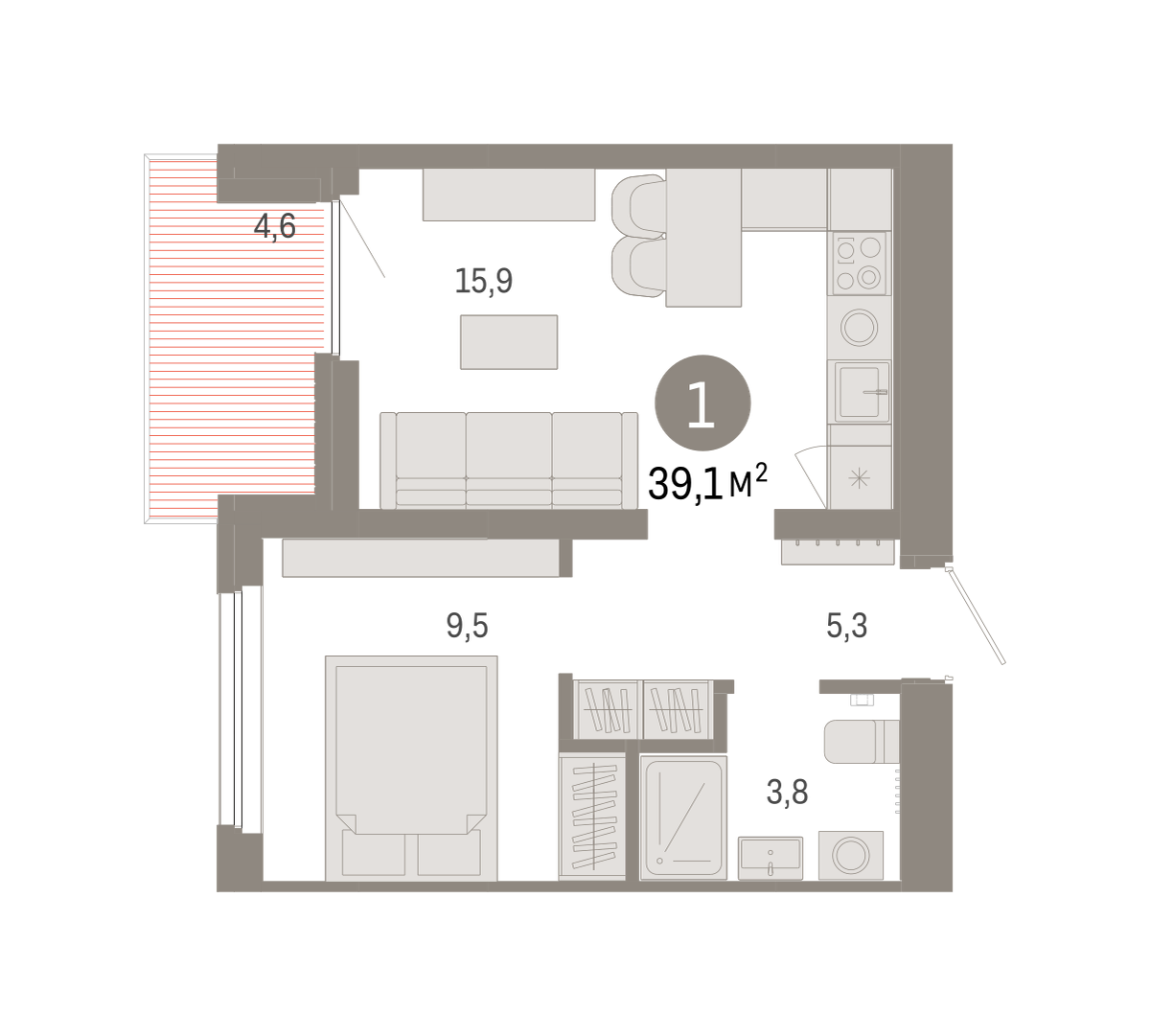 Квартира с кухней-гостиной и одной спальней в Бруснике в Академическом. Особенности планировки: балкон, предчистовая отделка. № квартиры в нашей базе: АКД04-Ж5.9.5.