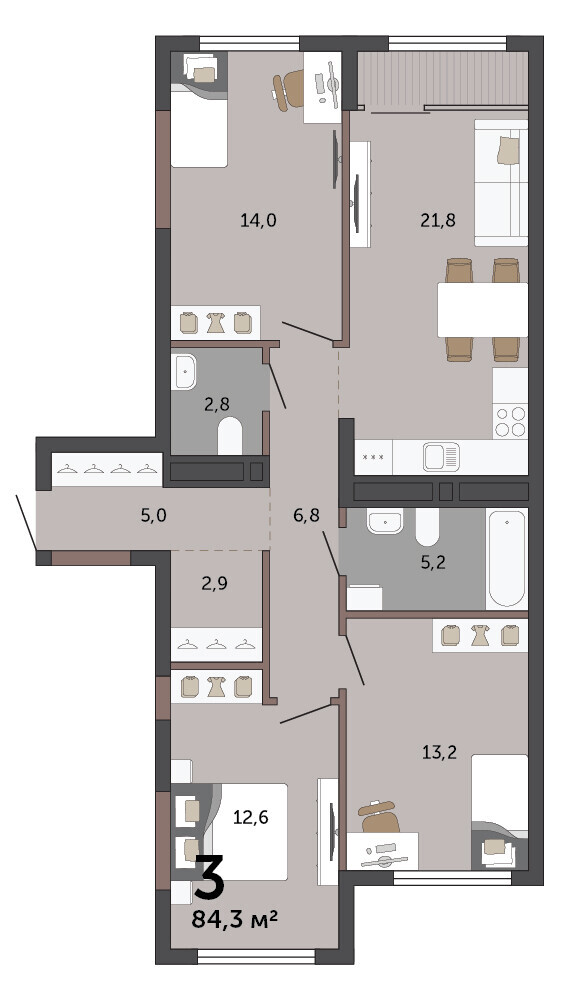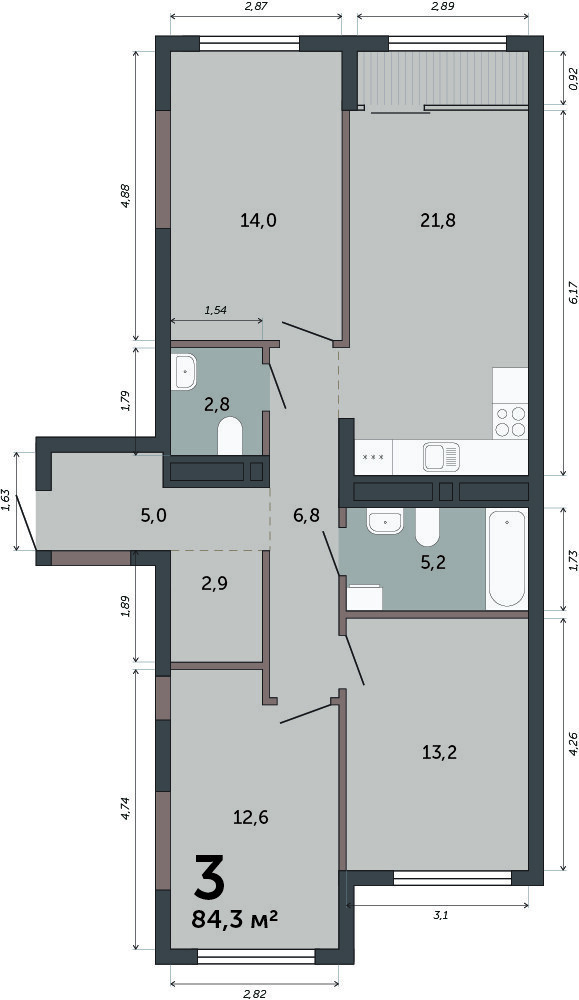 3-к квартира | 88.80 м² | 7 - 29 эт.
