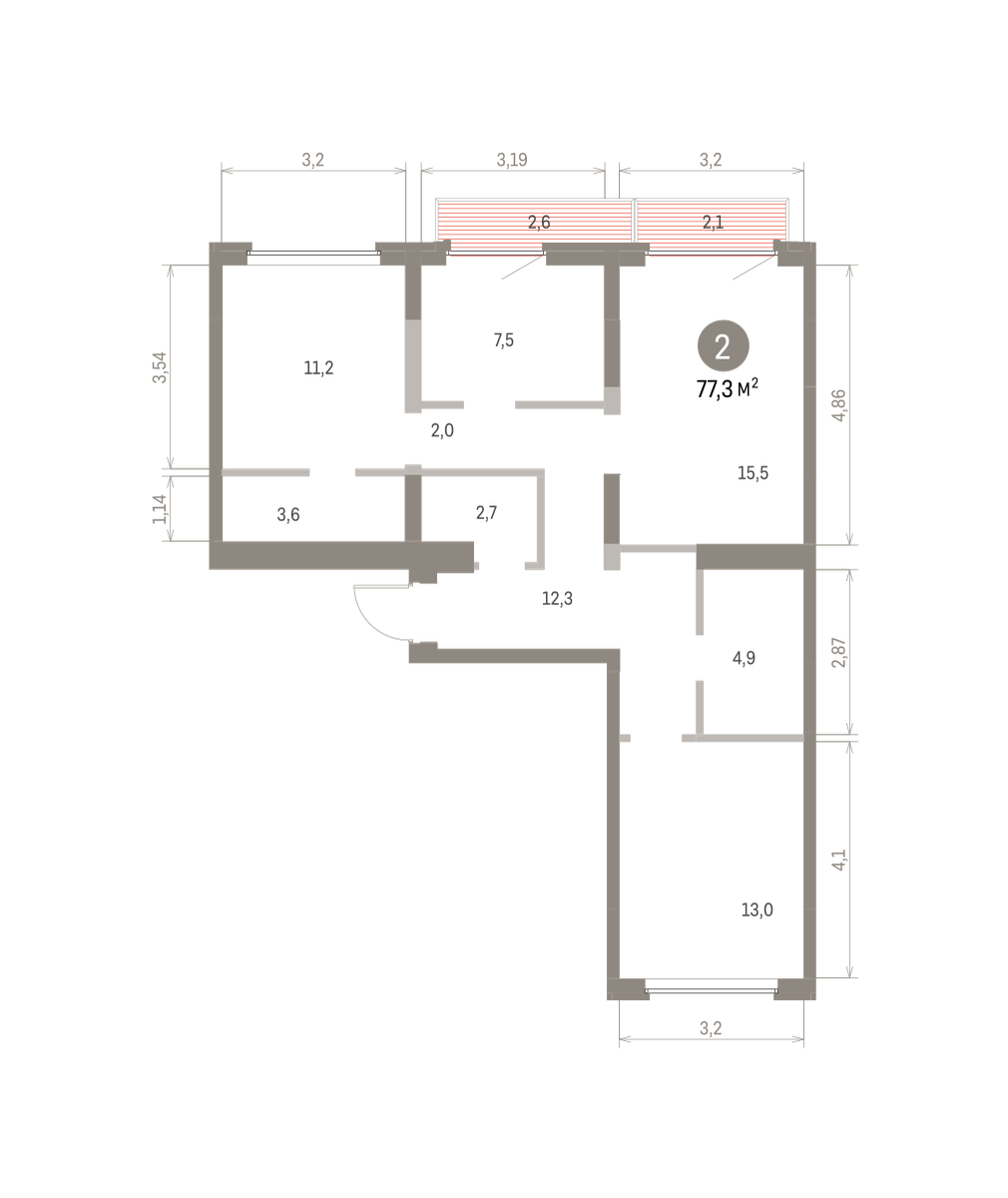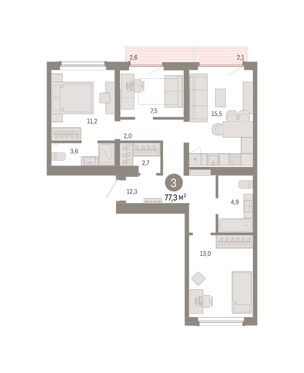Квартира с кухней-гостиной и двумя спальнями в Бруснике в Академическом. Особенности планировки: балкон, вид во двор, второй санузел, мастер-спальня, постирочная, предчистовая отделка, рабочий кабинет, разнесённые спальни.