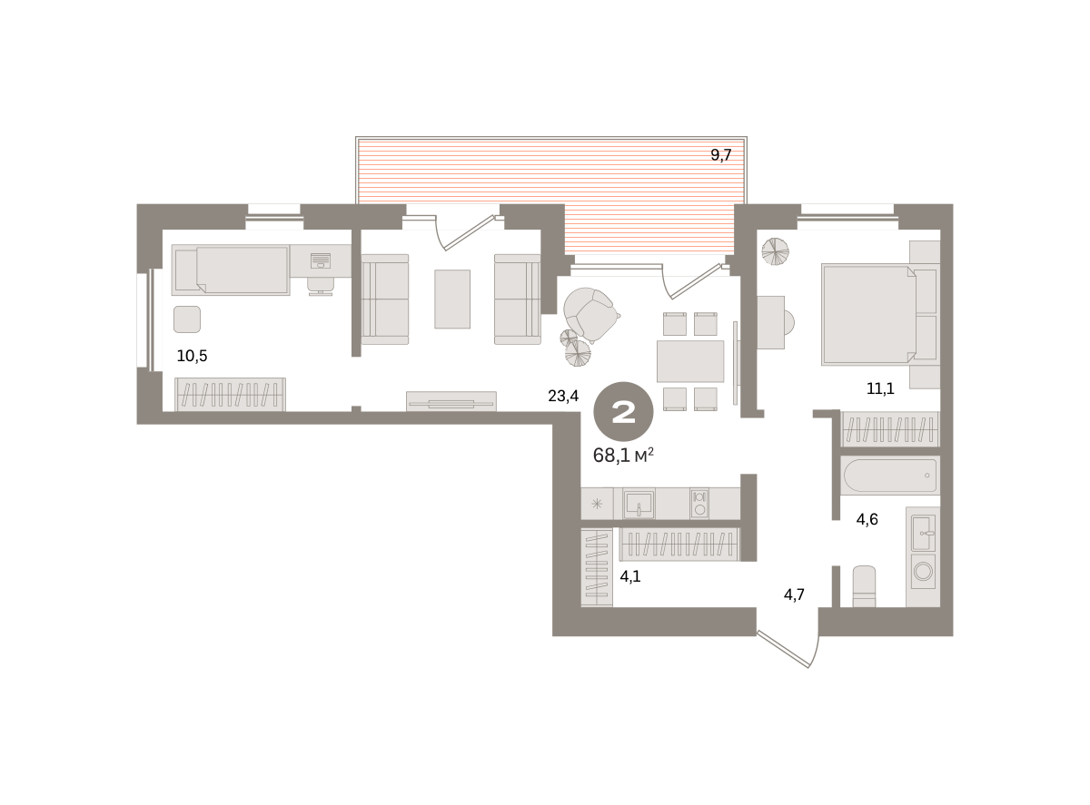 Квартира с кухней-гостиной и двумя спальнями в Южных кварталах. Особенности планировки: балкон, вид во двор, гардеробная, предчистовая отделка, разнесённые спальни.