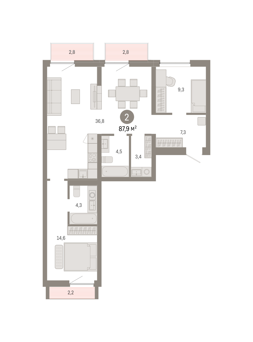 Квартира с кухней-гостиной и двумя спальнями в Южных кварталах. Особенности планировки: балкон, вид во двор, лоджия, мастер-спальня, окна на две стороны, постирочная, предчистовая отделка, разнесённые спальни.