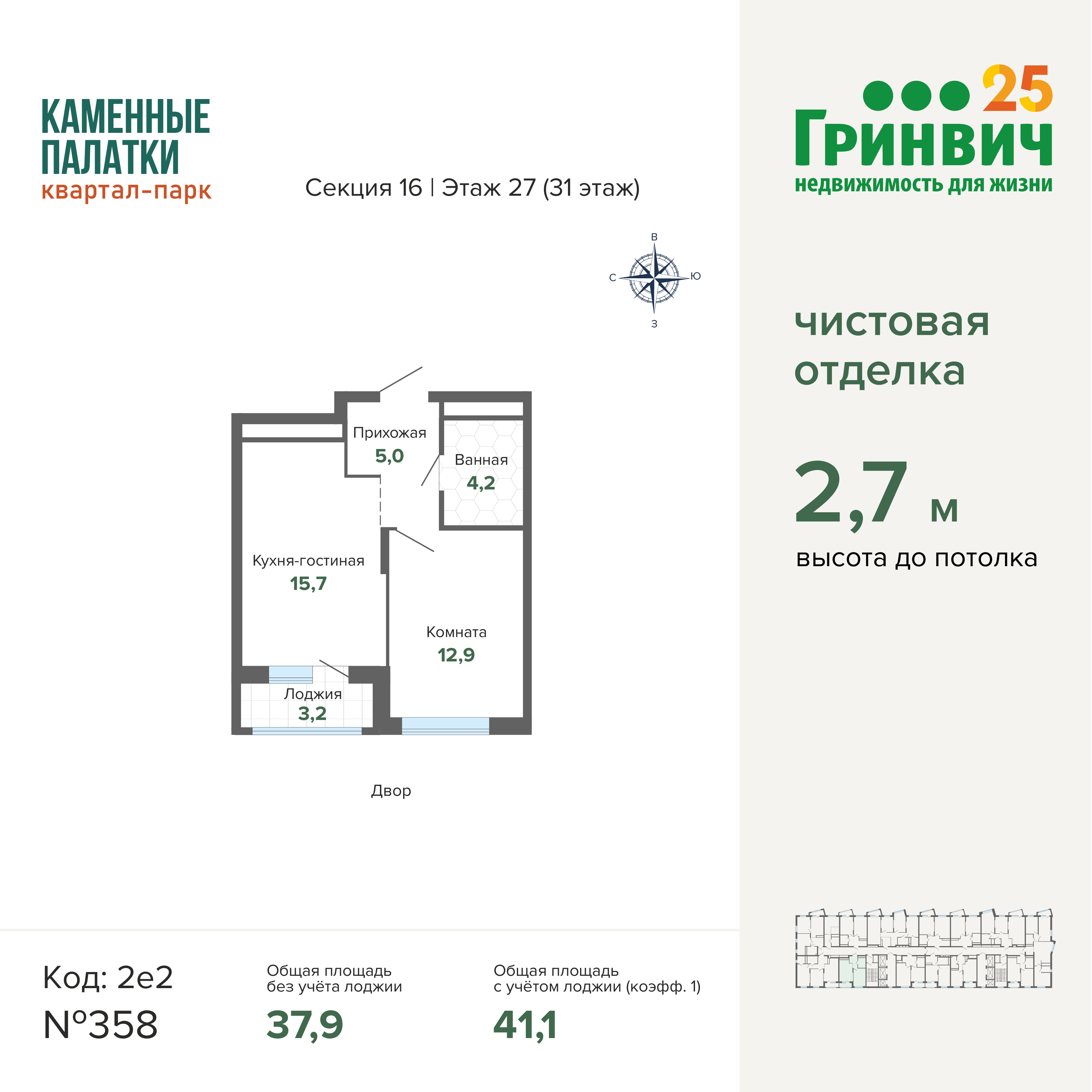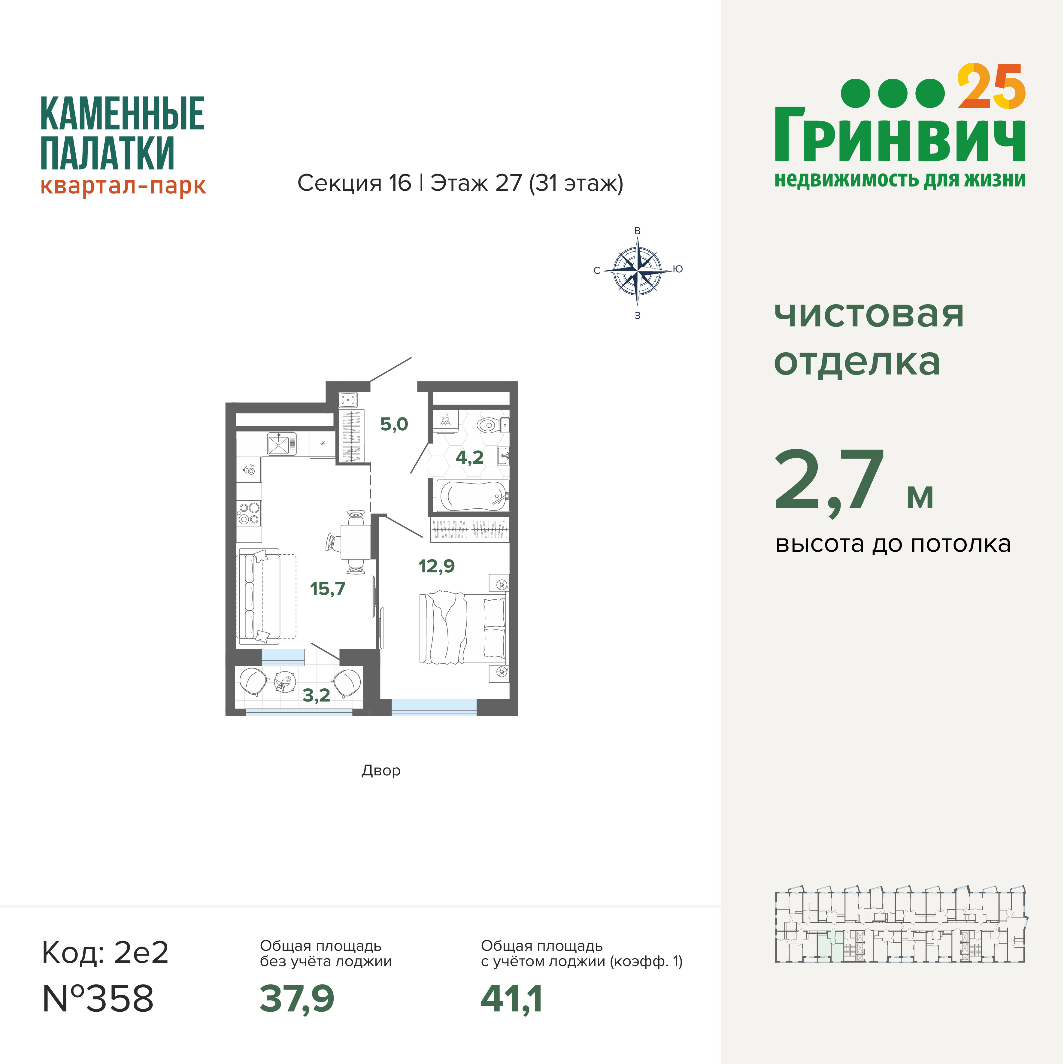 • Высокие потолки (2,7 м);