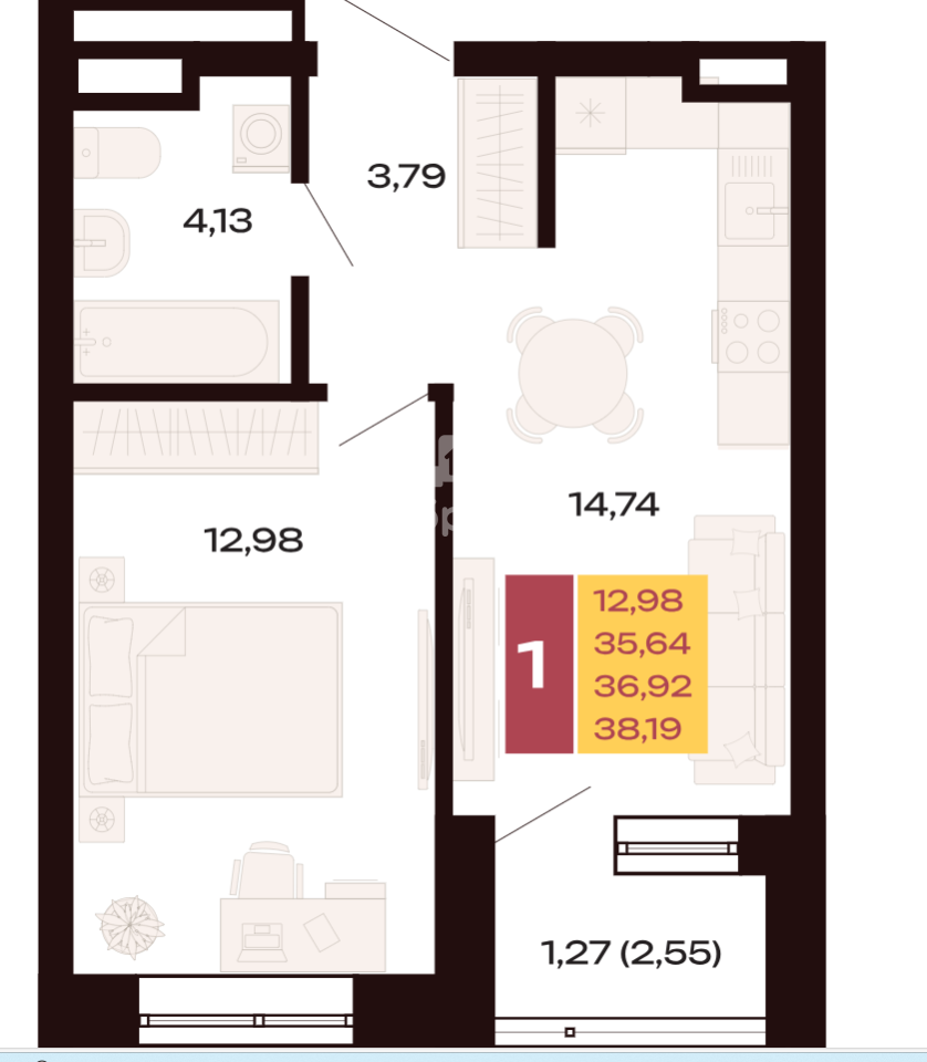 Продаю 1-к квартиру 38 кв.м. в новом доме