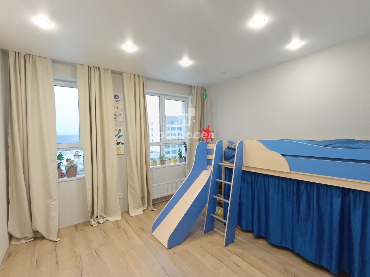 Большая кухня-гостинная 25м2, комнаты 15м2 с выходом на теплую лоджию и детская 13м2. Санузел совмещеннный в кафеле пол и стены.