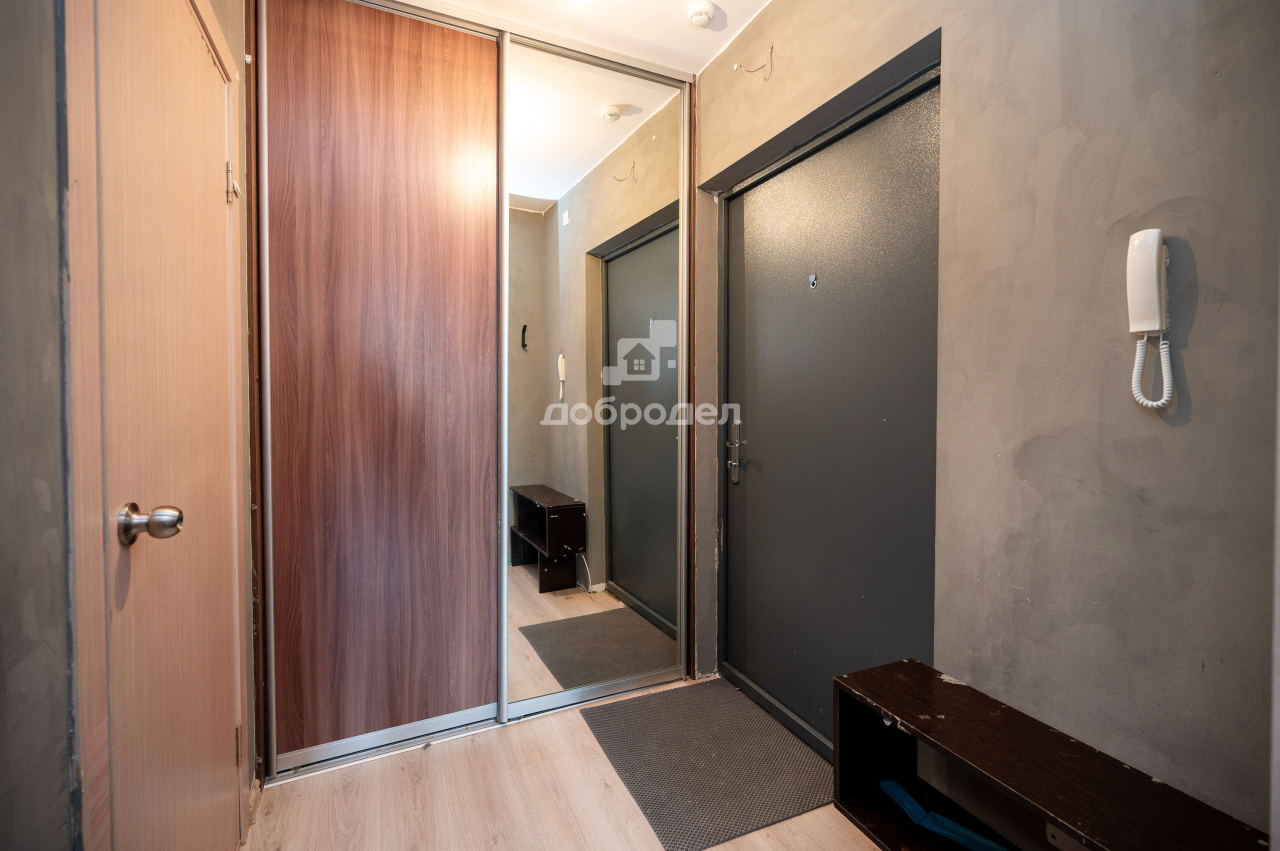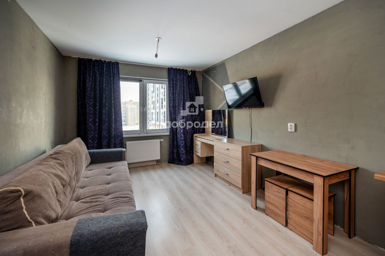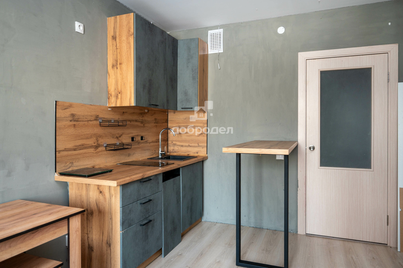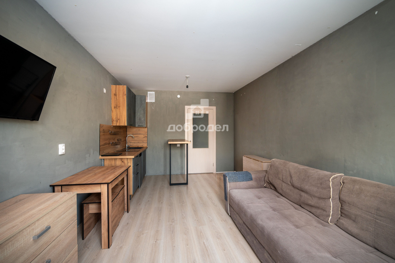 Комната правильной квадратной формы, оборудована кухонным гарнитуром (варочная поверхность) с барной стойкой. В квартире остается диван, стол + стулья, тумба для хранения вещей. Просторная вместительная прихожая, оборудована встроенным шкафом со стиральной машиной. Совмещенный санузел.