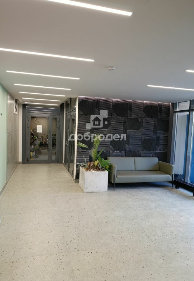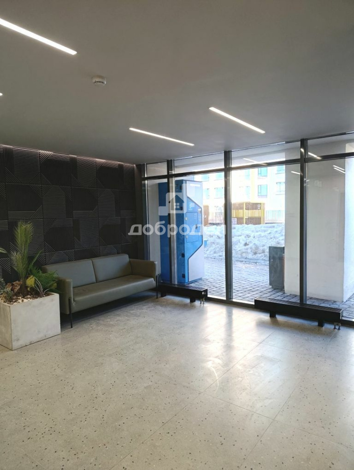 Просторный холл с мягкими зонами ожидания и колясочной.